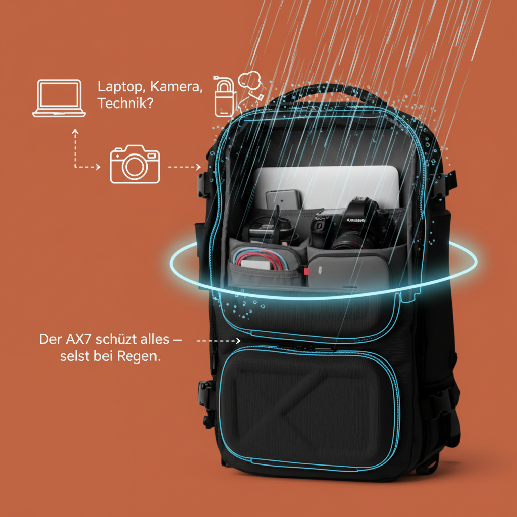Laptop, Kamera, Technik? Der AX7 schützt alles — selbst bei Regen.